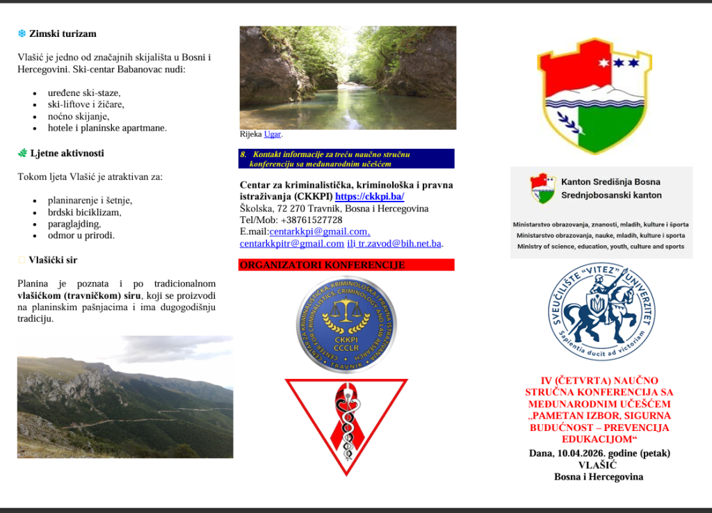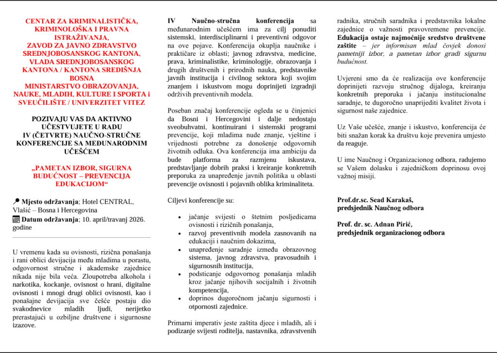 POZIV ZA IV NAUČNO STRUČNU KONFERENCIJU SA MEĐUNARODNIM UČEŠĆEM 25. Februara 2026. by admin POZIV Konferencija 2026Preuzmi Previous articleSinoć je u amfiteatru Srednjoškolskog centra u Travniku održana promocija knjige autora prof. dr. Seada Karakaša i prof. dr. Adnana PirićaNext article CENTRA ZA KRIMINALISTIČKA, KRIMINOLOŠKA I PRAVNA ISTRAŽIVANJA, Izdavač je prve knjige o femicidu u Bosni i Hercegovini Komentariši Poništi odgovorVaša email adresa neće biti objavljivana. Neophodna polja su označena sa *Komentar * Ime * Email * Web stranica Sačuvaj moje ime, email i web stranicu u ovom browseru za buduće komentare. Δ